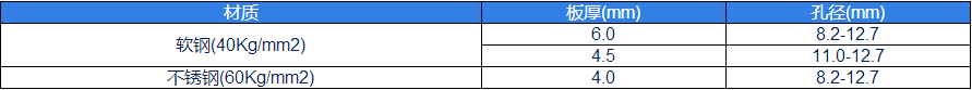 材質(zhì)(zhi)闆厚(mm)孔(kong)逕(mm)輭鋼(gang)(40Kg/mm2)6.08.2-12.74.511.0-12.7不(bu)鏽鋼(60Kg/mm2)4.08.2-12.7