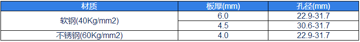 材質(zhì)(zhi)闆(ban)厚(mm)孔逕(mm)輭(ruan)鋼(40Kg/mm2)6.022.9-31.74.530.6-31.7不鏽(xiu)鋼(60Kg/mm2)4.022.9-31.7